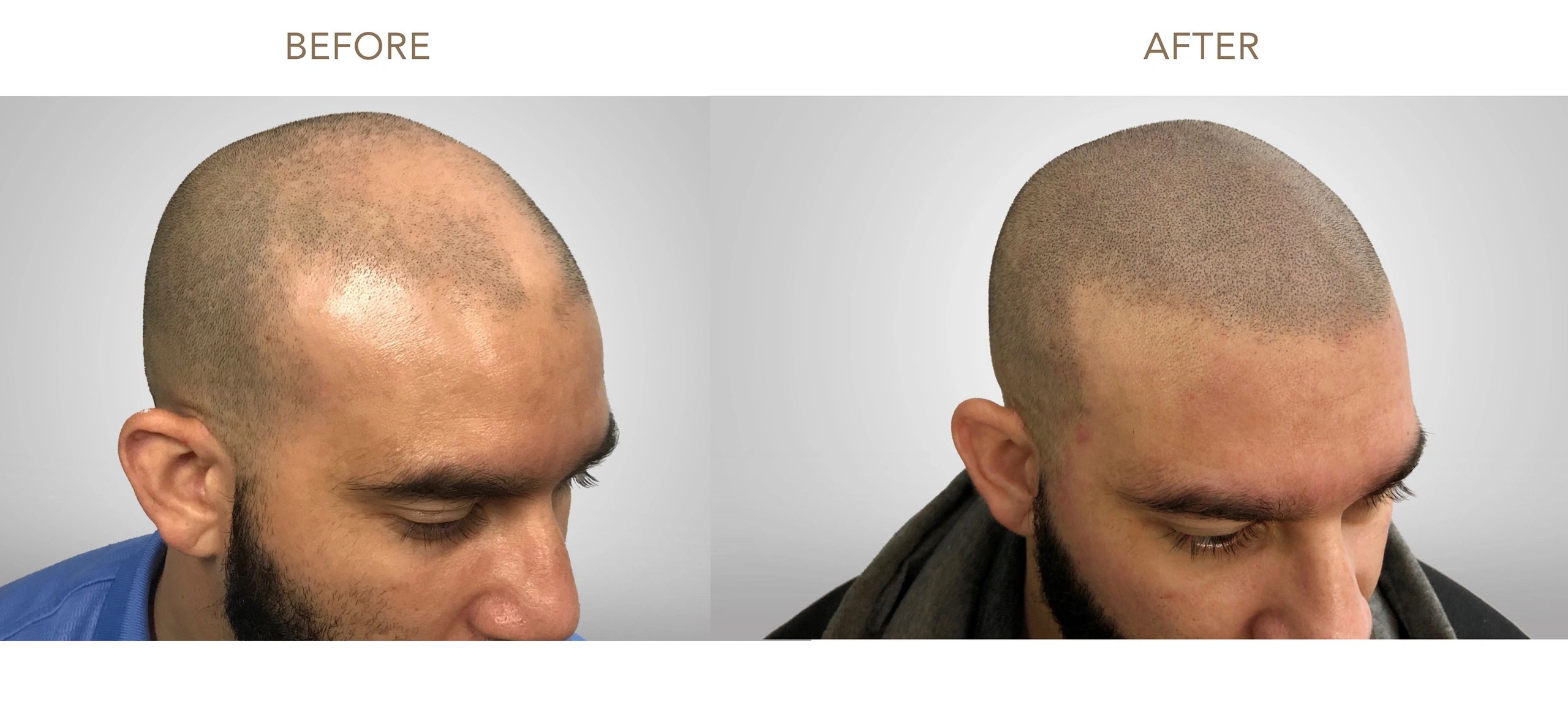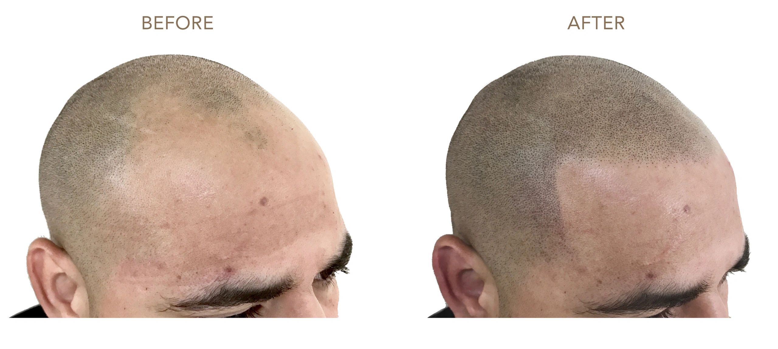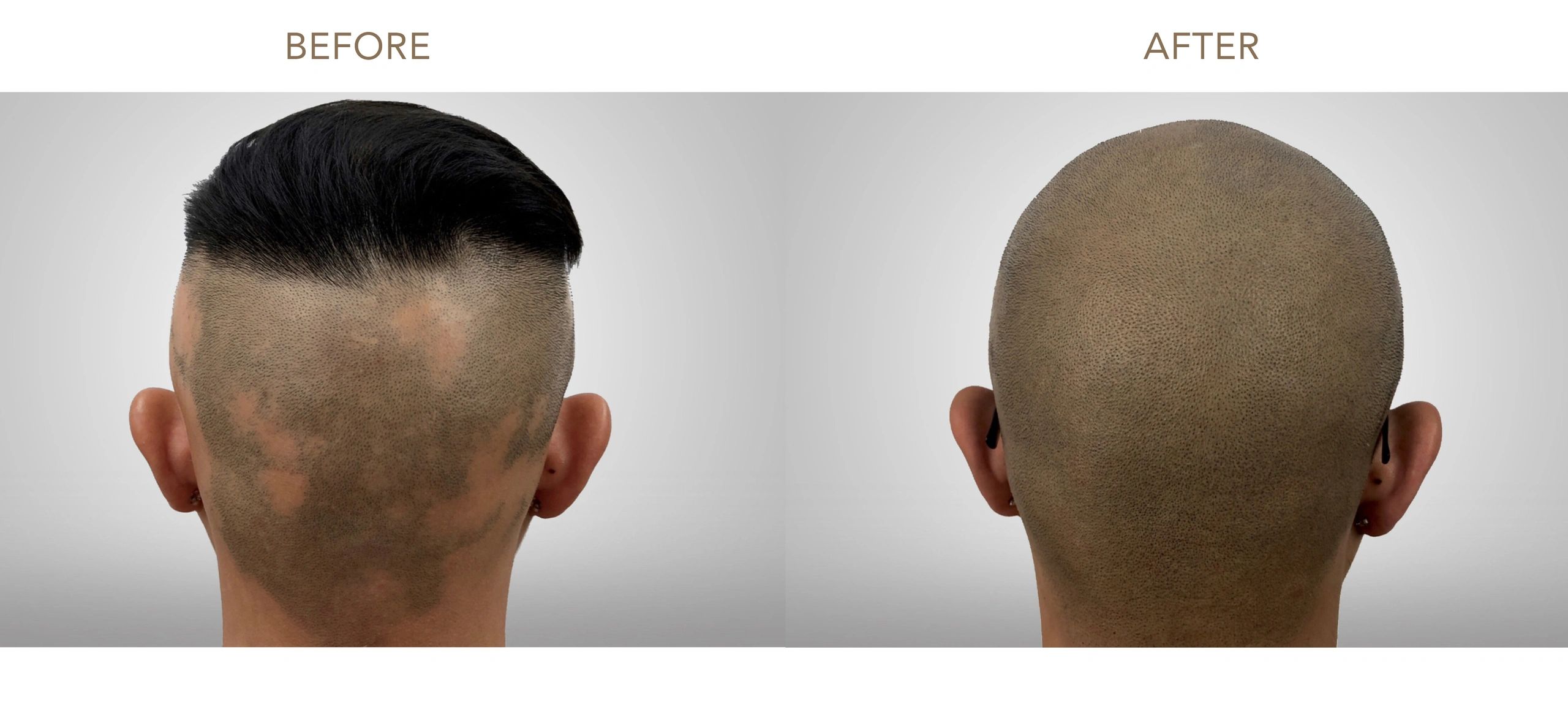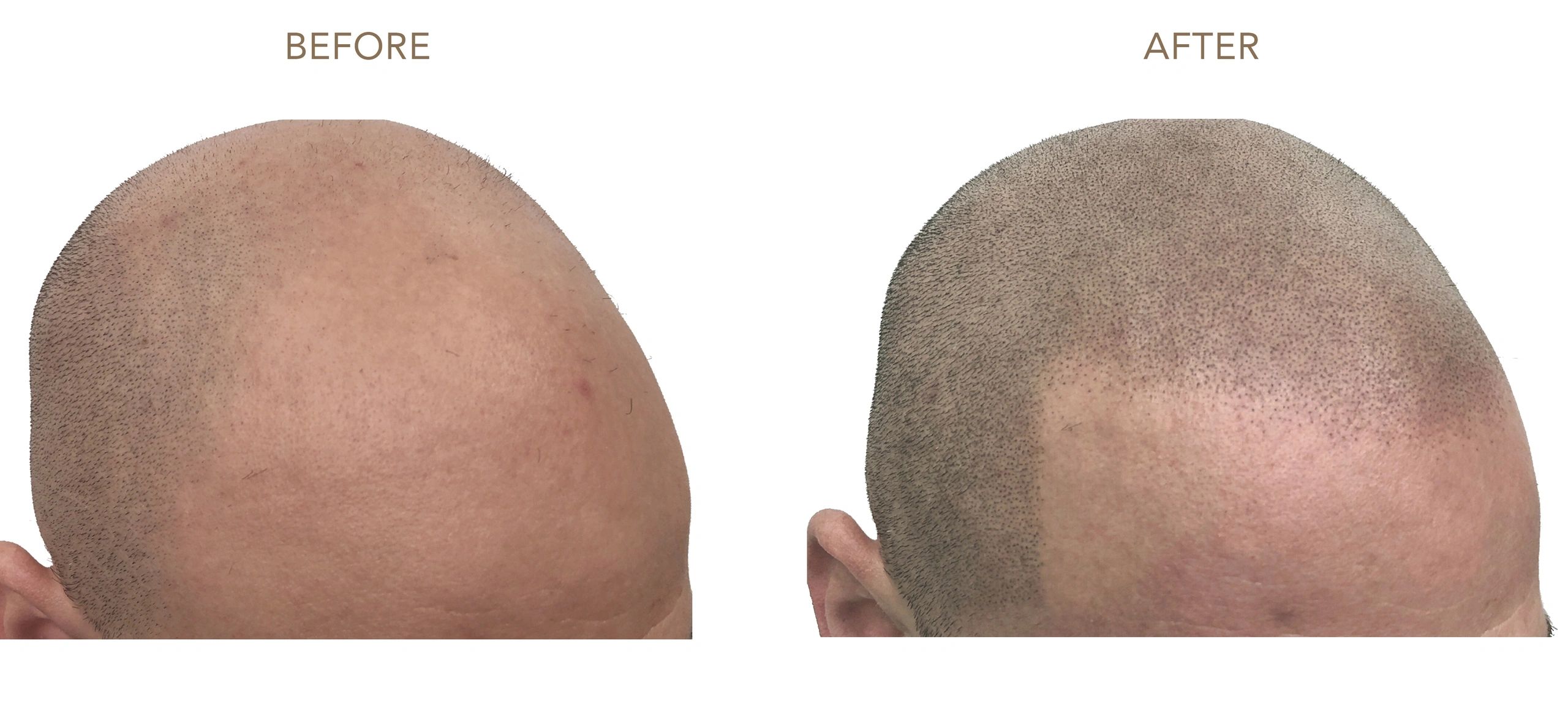 Hair follicles are replicated in balding/thinning areas, using a device and pigments designed specifically for SMP, to give the illusion of a shaved head.